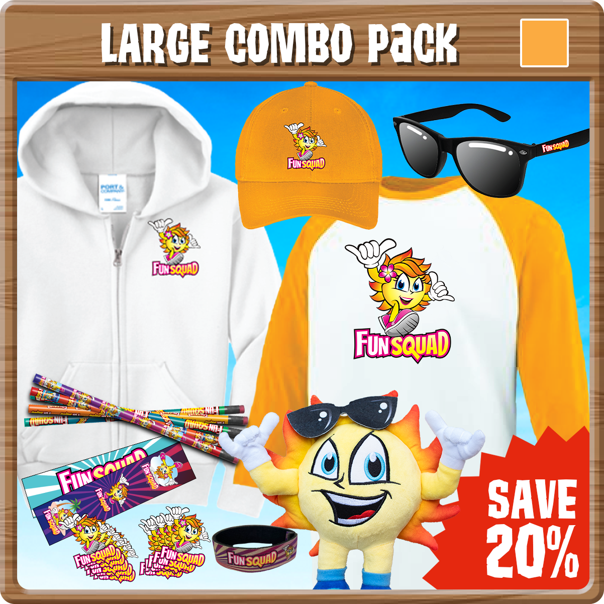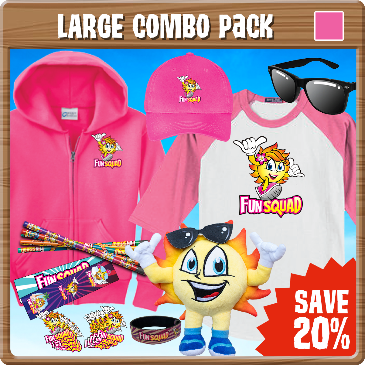 Save When You Purchase a Pack!! Large Combo Pack Includes: Full Zip Hoodie Raglan T-shirt Plushie Hat Wristband Bookmarks (2) Sunglasses (1) Stickers (4) Temporary Tattoos (5) Pencils (4) Please Note: Most of our Merch is custom created special for each of our fans! Please allow 3-5 business days for production/ handling prior to expecting...
